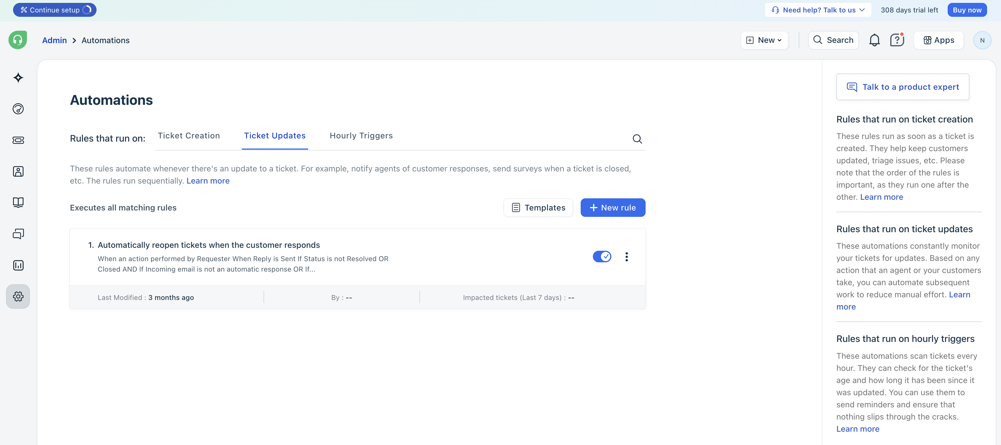 To manage these types of automation rules, go to Admin > Workflows > Automation Rules and click the Ticket Updates tab.