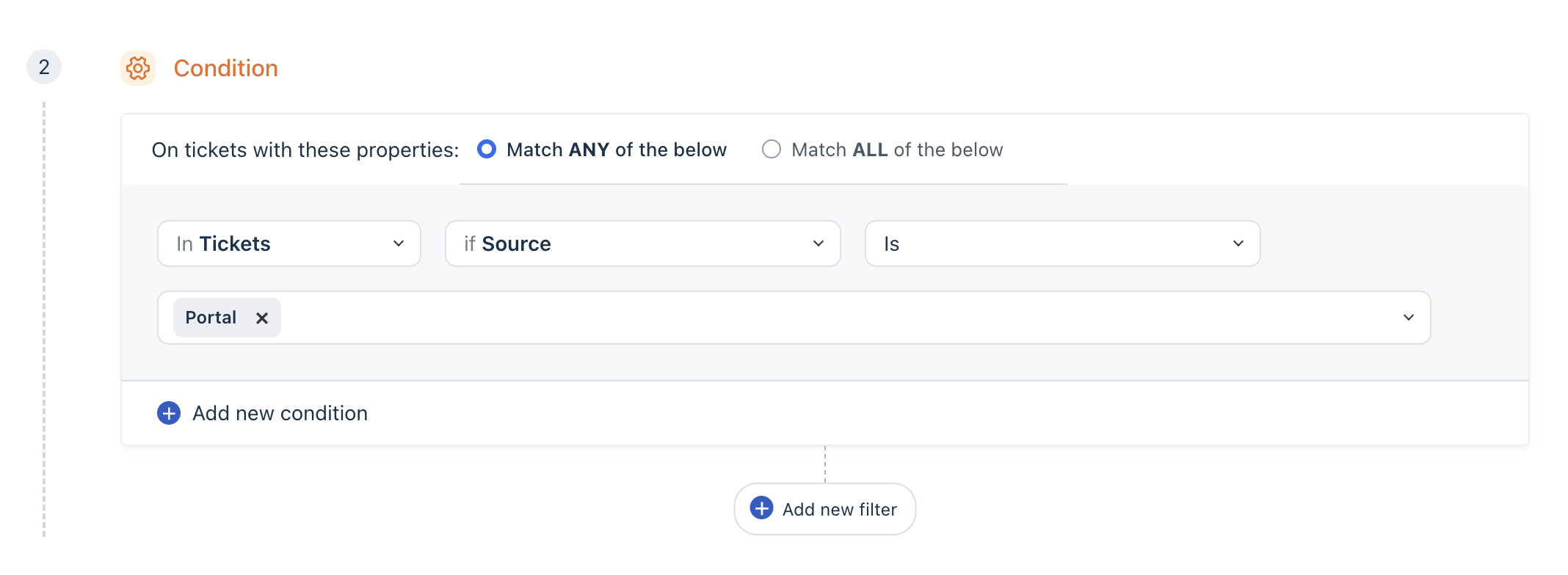 - Click Add new condition to specify additional ticket properties. You can specify whether the rule should be triggered if ANY of the conditions are met, or if ALL must be met.