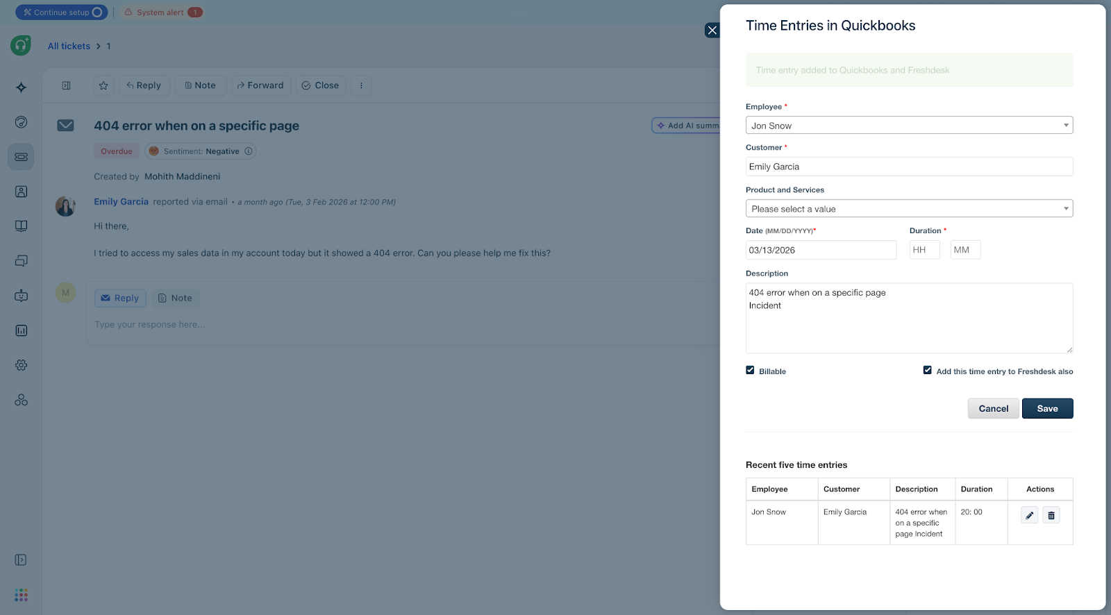 Time tracking: Track time spent on tickets in Freshdesk and log them as billable "Time Charge" sales transactions against the appropriate customer in QuickBooks.