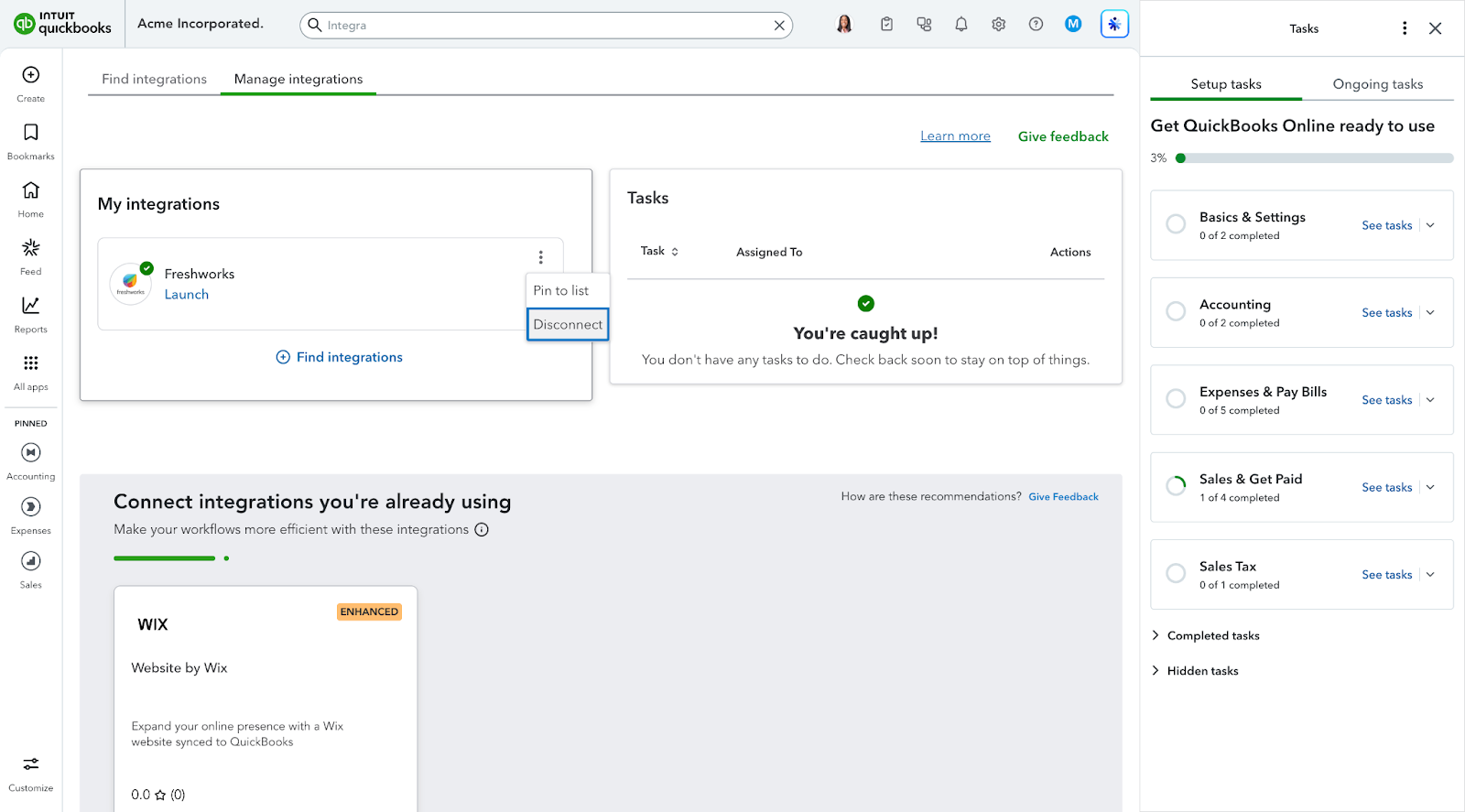 Go to QuickBooks, navigate to My Integrations, then Manage Integrations, find Freshworks, and select Disconnect.