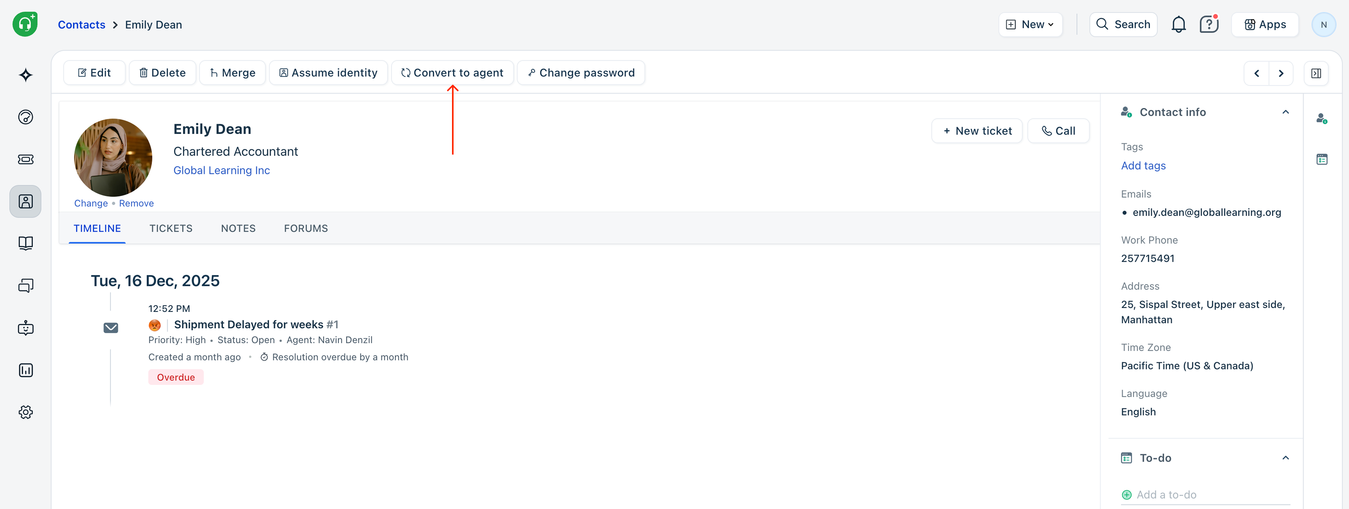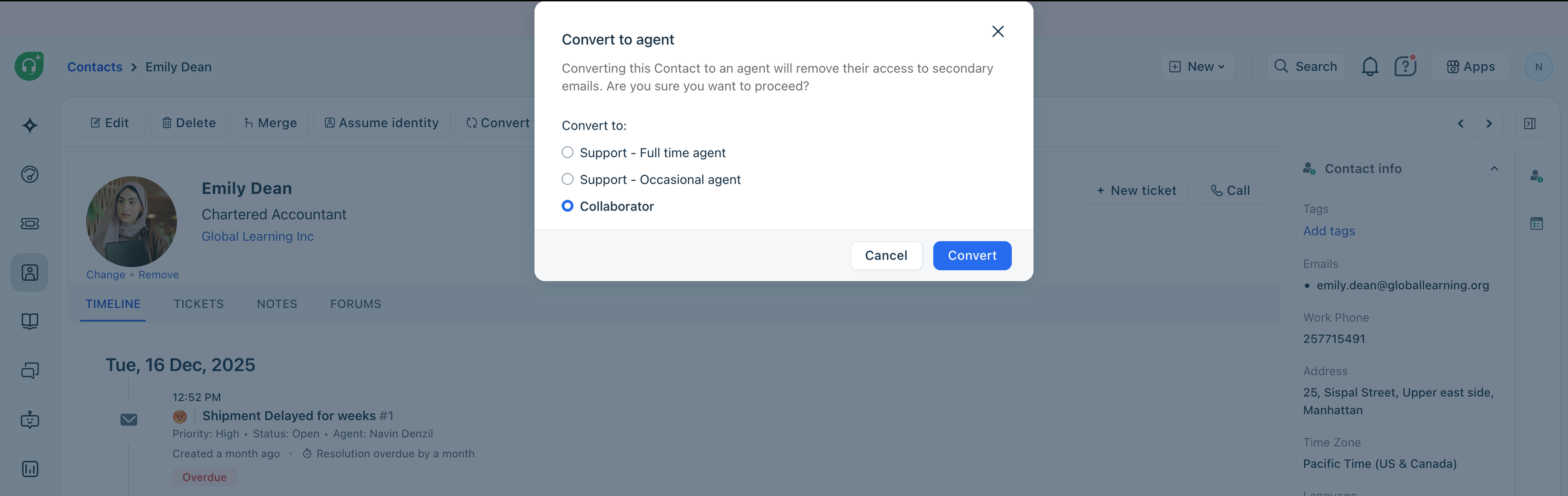 - Convert a contact into a Collaborator. Support agents cannot be directly converted to Collaborators. However, you can delete the agent and then convert their contact into a Collaborator. To convert a contact to a Collaborator, on the Contact details page, click Convert to agent on the top and choose Collaborator.
