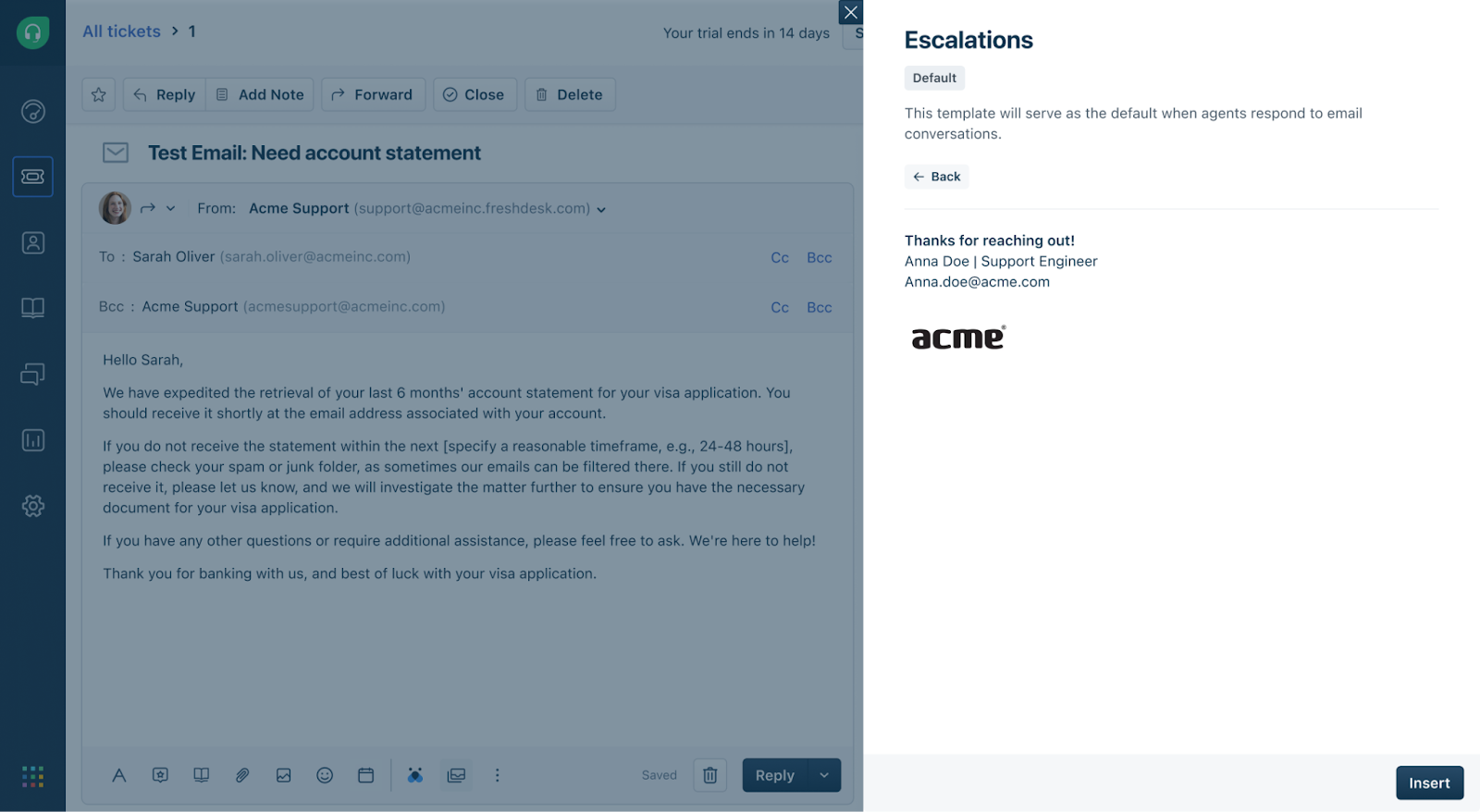 Choose the template and click Insert to add the template to the ticket.