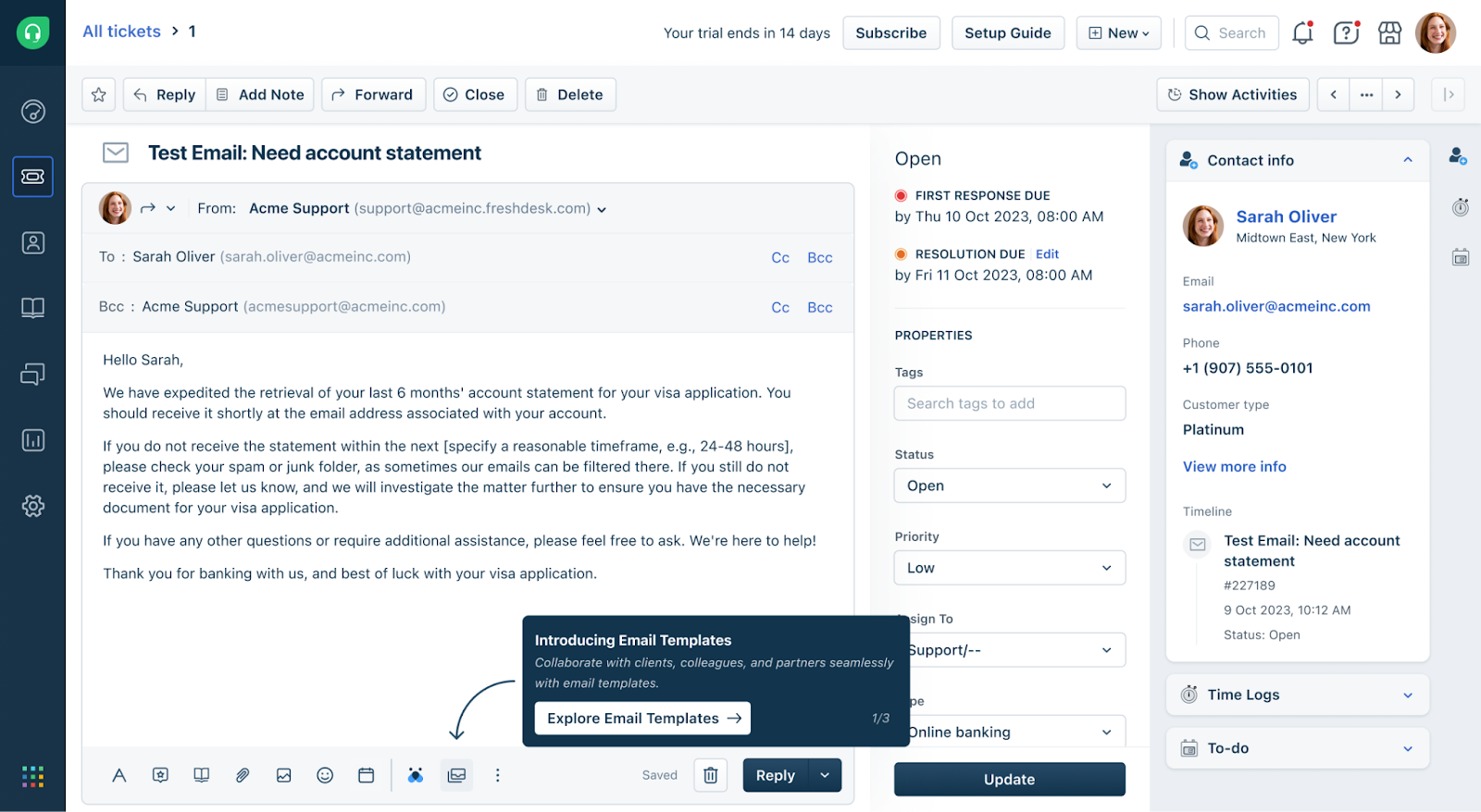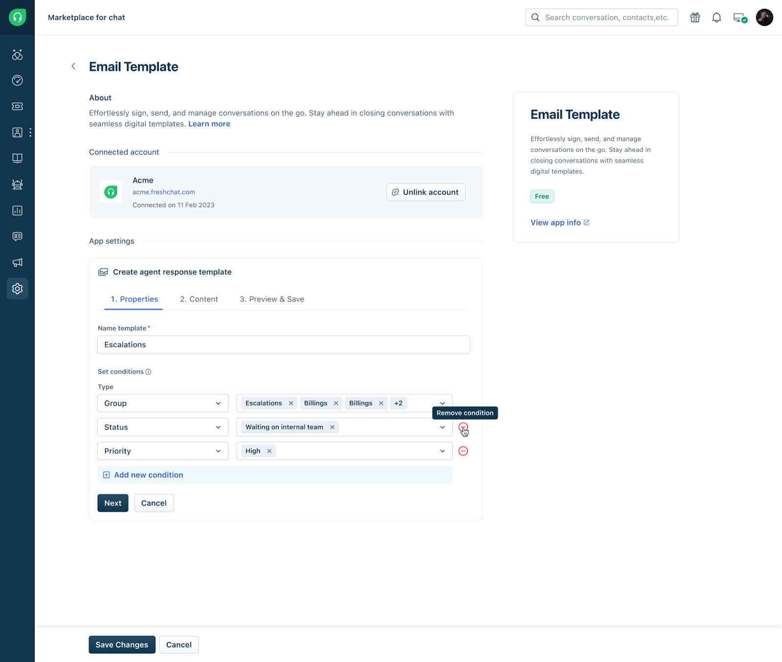 Under the Properties tab, give your email template a name, and set the conditions to which the email template should match the ticket. You can choose a group, ticket type, ticket status, ticket priority, and product. For example, suppose you set the conditions as "Billing" group, "Refund Request" ticket type, "Open" status, "High" priority, and "Sweaters" product. In that case, this specific email template will only be applied when all these conditions are met. Creating multiple condition sets to map each scenario to a unique email template ensures consistent and relevant communication.