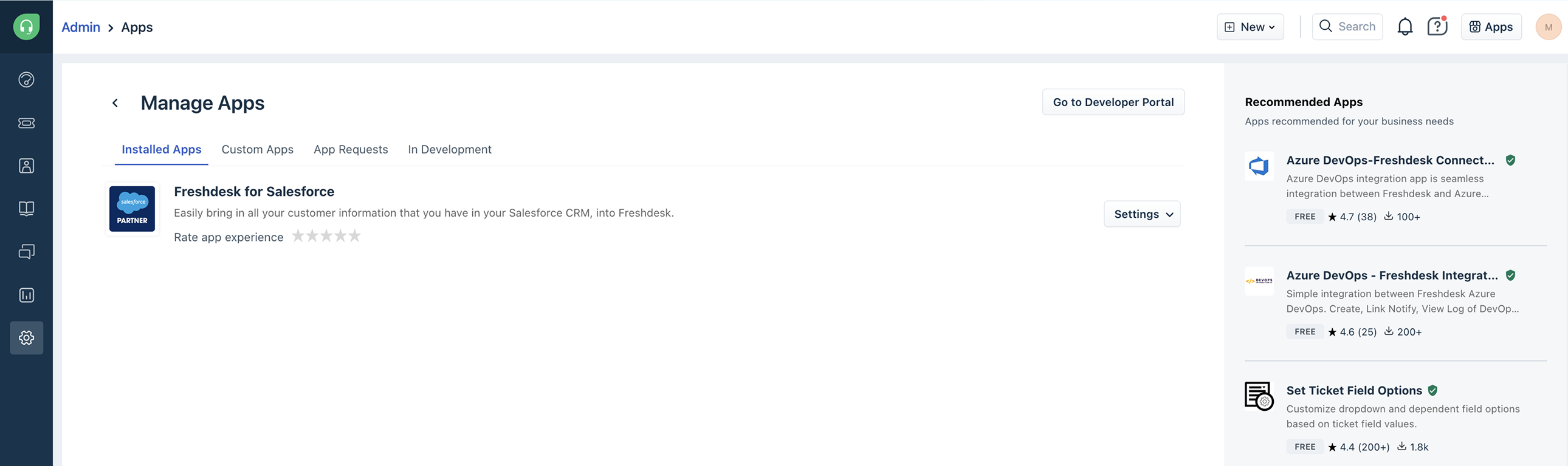 - Under the Installed Apps tab, click Settings near the app with the name Freshdesk for Salesforce