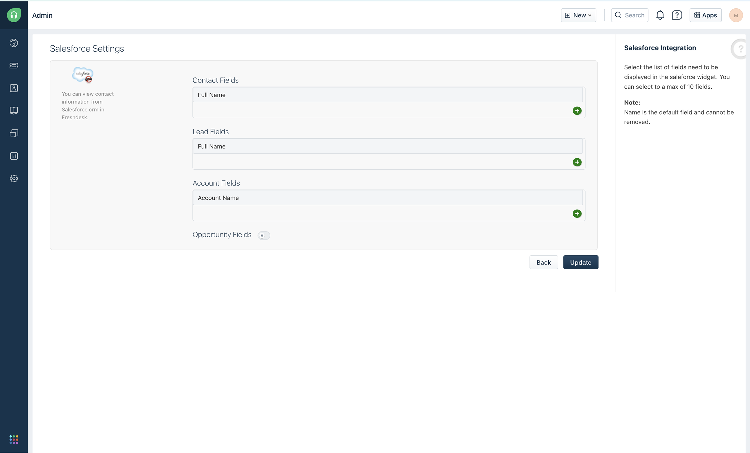 - Select the Contact, Account, Lead, and opportunity fields you want to show in Salesforce widget and click Update