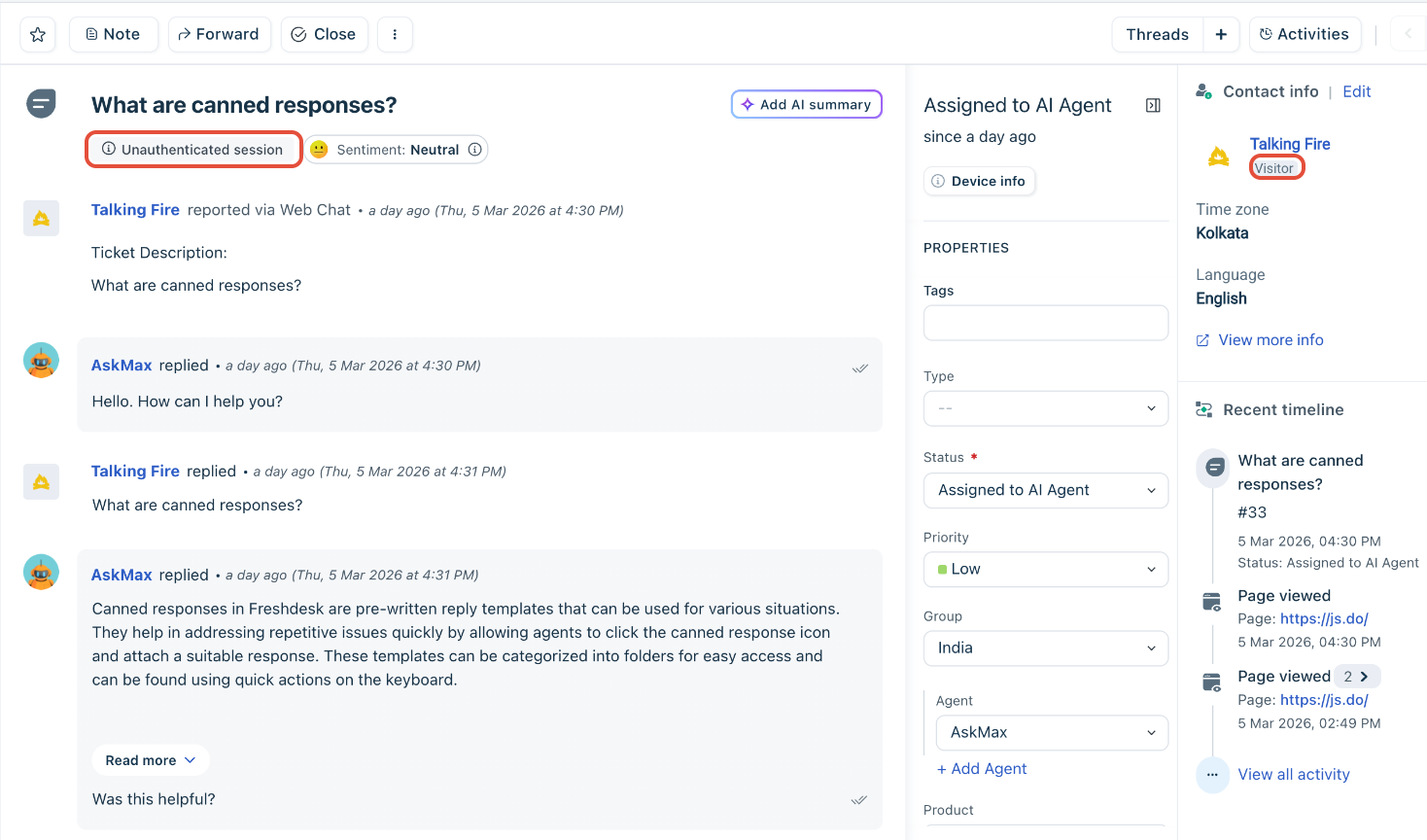 Once you enable JWT authentication, the ticket details page displays indicators that help agents identify whether a session is authenticated.