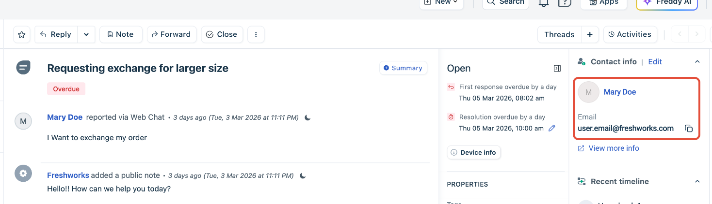 This payload identifies the user by email address and includes additional contact and ticket properties. Freshdesk creates or updates the contact using the email and prepopulates the ticket with the specified details.