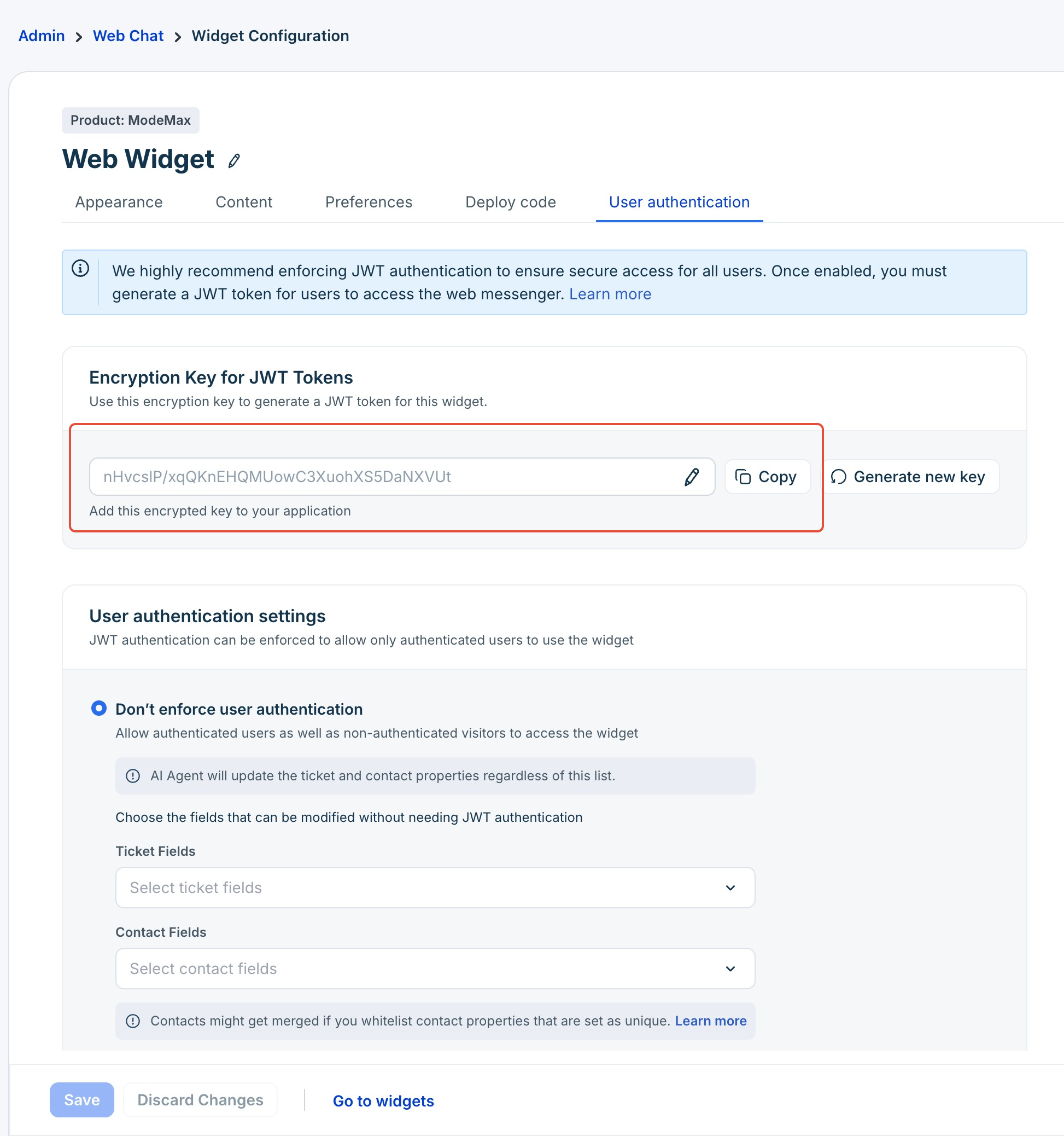 - Select the ticket fields and contact fields that can be modified even if JWT authentication is disabled.