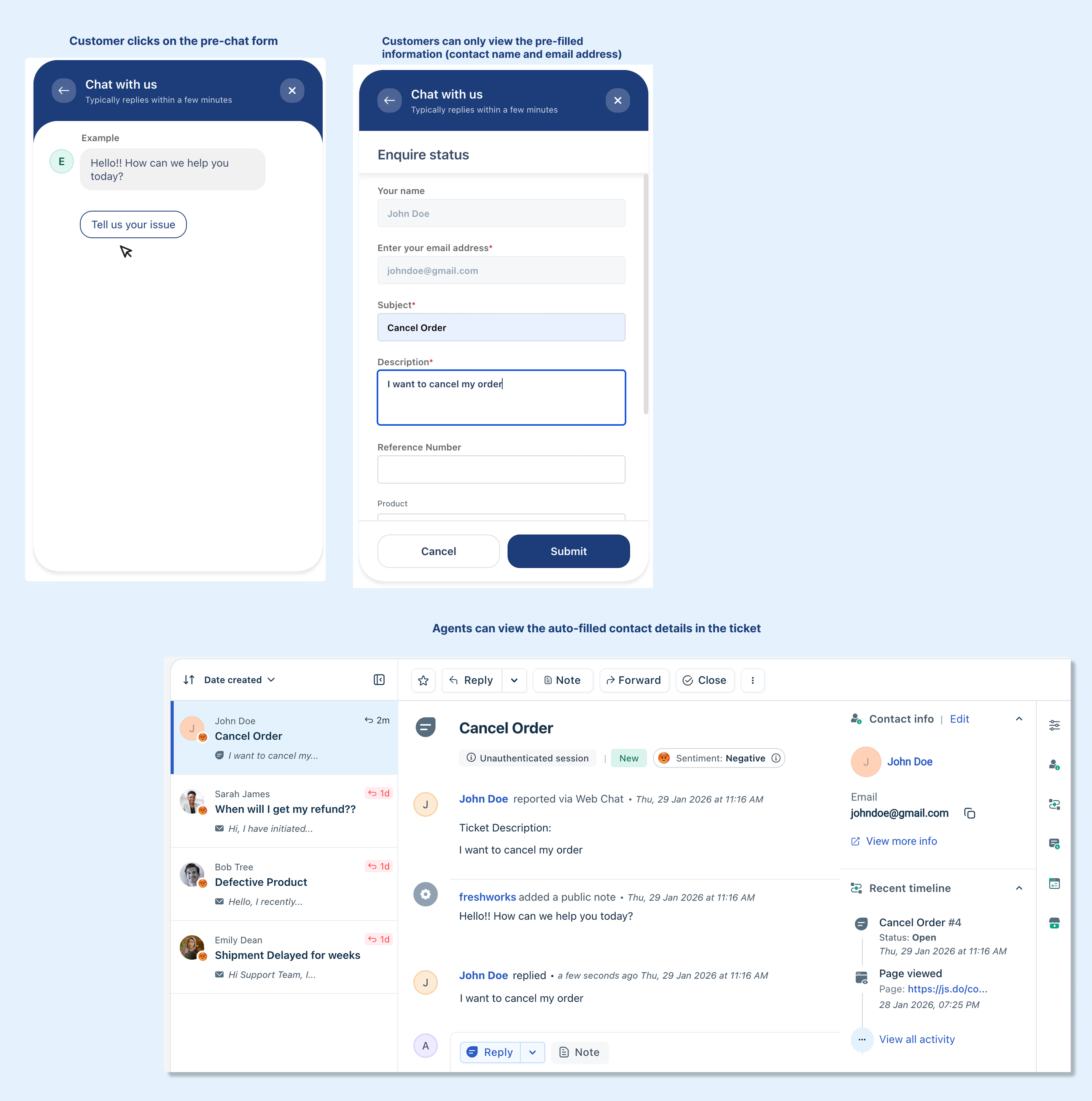 Additionally, with pre-chat forms, you can control the visibility of pre-filled customer details, such as contact name and email address, that are automatically populated for logged-in users through a JWT token or widget deploy code (payload).