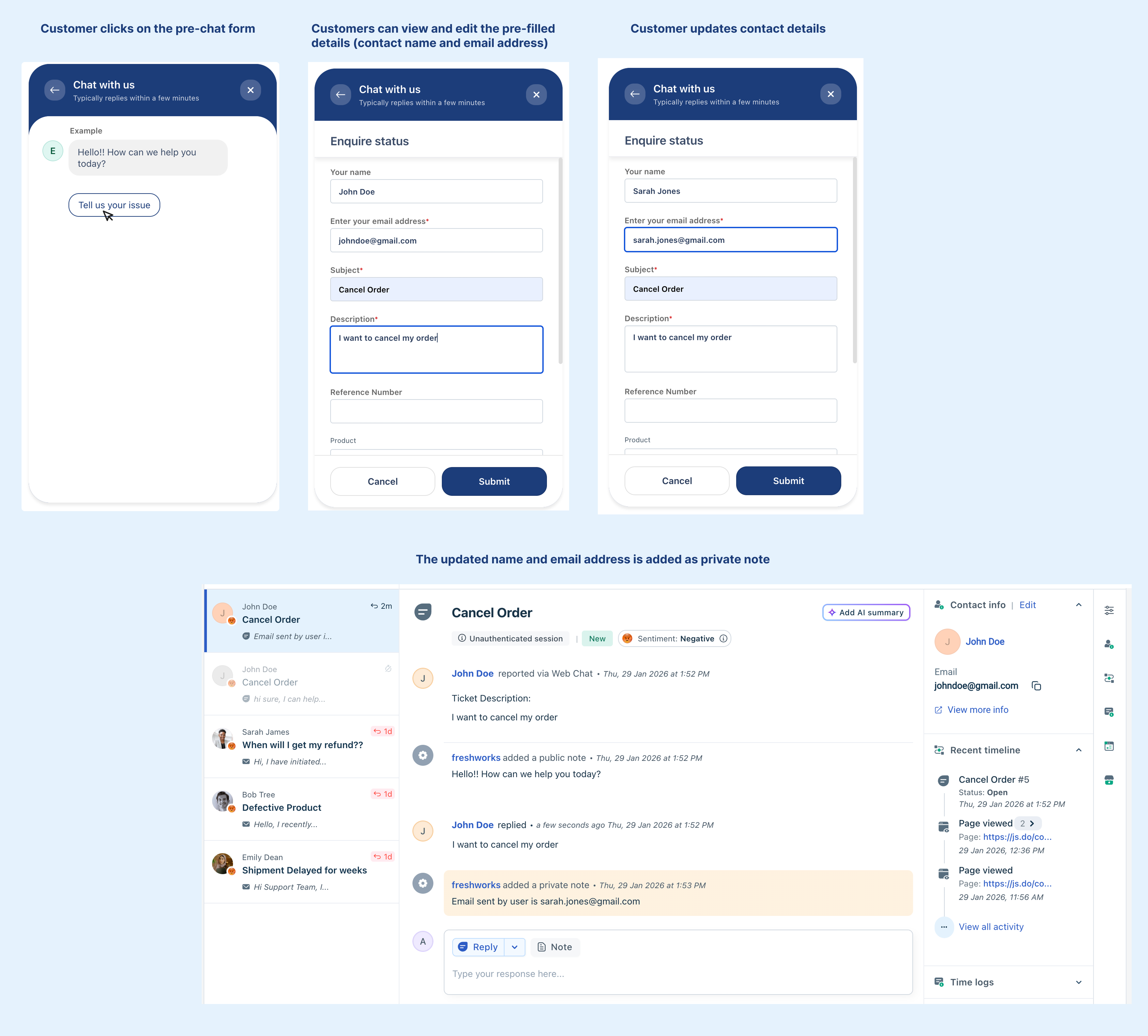 - The updated name or email address is added as a private note to the ticket